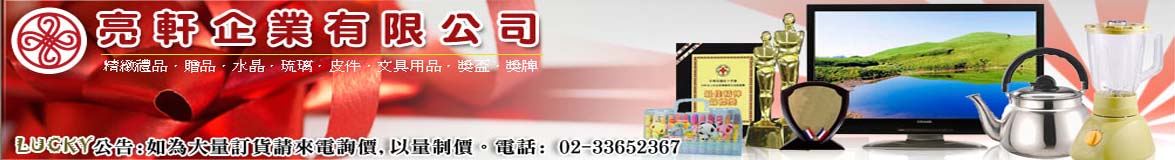 亮軒企業經營理念以『專業、服務、品質、貼心』為方針。 在百貨領域裡,客製化的設計為客戶打造最佳的廣告效果, 以最適合的禮品打動收禮人的心,讓送禮和收禮都開心。我們擁有豐富的經驗,累積了一定的客戶實績,對於產品質量和營銷管理有著不變的堅持,是國內少數能提供完善企劃專業的公司之一。 在工商服務領域裡,提供職業安全衛生及環保等技術服務之顧問輔導管理,針對各部份進行各項輔導及建議改善,一起創造更安全舒適的就業場所作業。 專營精緻禮品.廣宣品.獎座獎牌.水晶琉璃.皮件.文具用品.小家電.各大活動禮品;工商服務及技術服務。