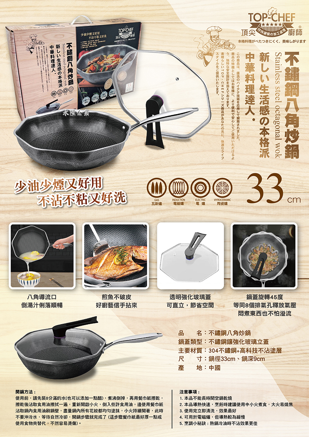 頂尖廚師不鏽鋼八角炒鍋33CM
